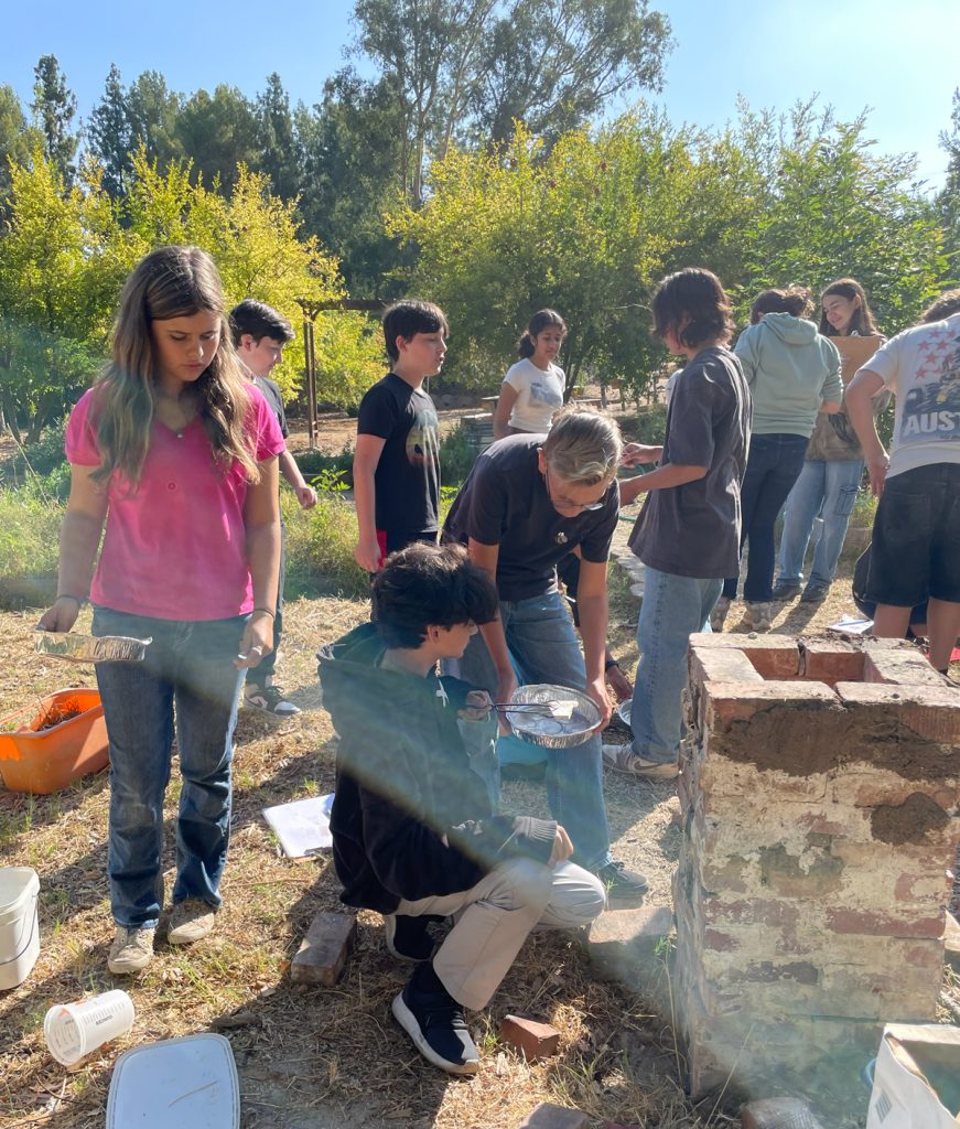 In 7th grade Inorganic Chemistry, they took their classroom to the garden to observe the Lime Cycle. They prepared the lime kiln for firing the marble or calcium carbonate. Next, the students layered charcoal and marble, and they fired up the kiln. At the end of the day, they revisited the kiln to observe the firing and the transformation of calcium carbonate into calcium oxide or quick-lime. When water was added, it steamed and fizzled, and it became calcium hydroxide or slaked lime. In these demonstrations, the students observed the transformation from one state to another. The hard marble became dried out and crumbly in the burning process. When water was added, a transformation took place, and putty was created. When sand was added to the putty, the substance hardened again to form cement. The Lime Cycle came full circle.